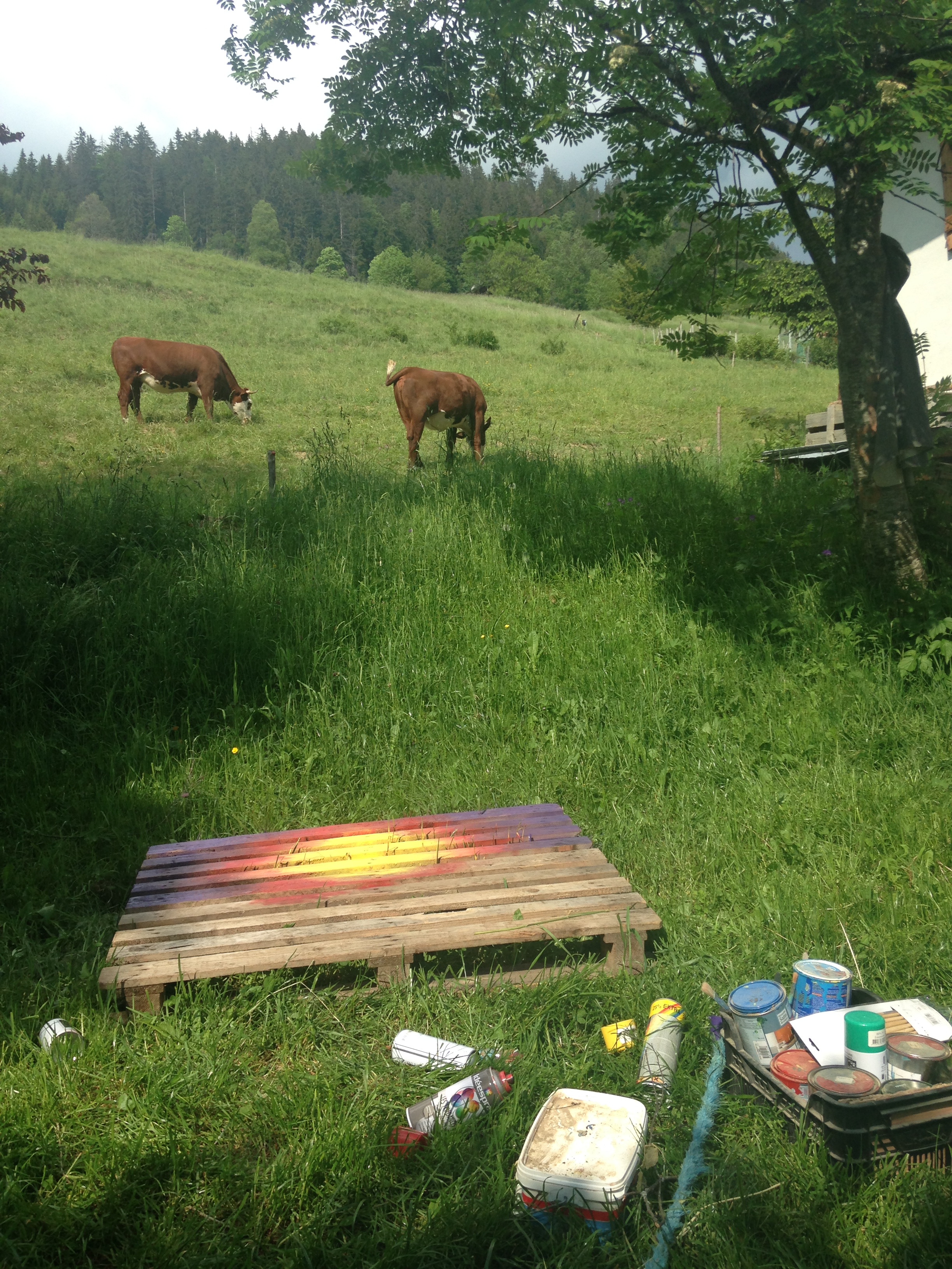 Daarna wachtte me een leuke klus: De boerin had een pallet ergens rechtop in de tuin staan, als een soort schot waarachter Salut niet mocht komen, en wilde die geverfd hebben. Ik haalde een krat met potten en spuitbussen verf naar beneden en deed maar wat. Achter me graasden koeien. Naast me was Salut komen liggen.