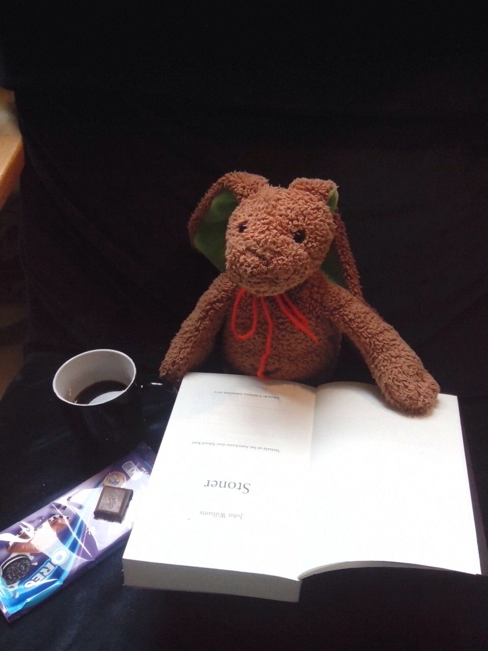Zeg Haas, waarom zei je het me niet, als je mee wilde lezen met Stoner of een slokje wilde uit mijn koffie? Ik had het graag met je gedeeld! Misschien dat ik de ChocoladeOreokoekjes zelf had opgegeten, zo eerlijk wil ik best zijn, maar had ik je niet op zijn minst op schoot genomen en de bladzijdes voor je omgeslagen! Of, nu ik je zo wijs en zelfstandig achter dat boek zie zitten, ontdaan van al je fluffigheid en pluizig brein, misschien had ik je me laten voorlezen, met de lage en warme stem van een wijs Haas… Oh Haas, had het me gezegd!