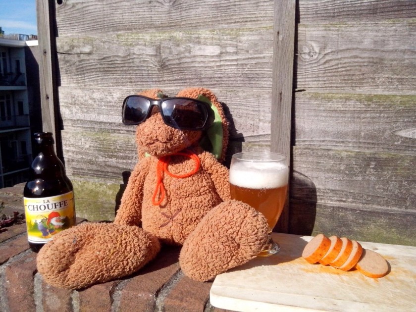 Een week na mijn aankomst in Notre Dame de Bellecombe krijg ik bericht op mijn telefoon. Het is een foto van Haas met een La Chouffe in de zon. Een brede zonnebril hangt om zijn snoet en een goed stuk worst ligt in plakjes naast hem. Haas was een knuffelhaas, een zacht maatje naast me op het kussen. Hoe kan hij nu opeens zo keihard chillen?