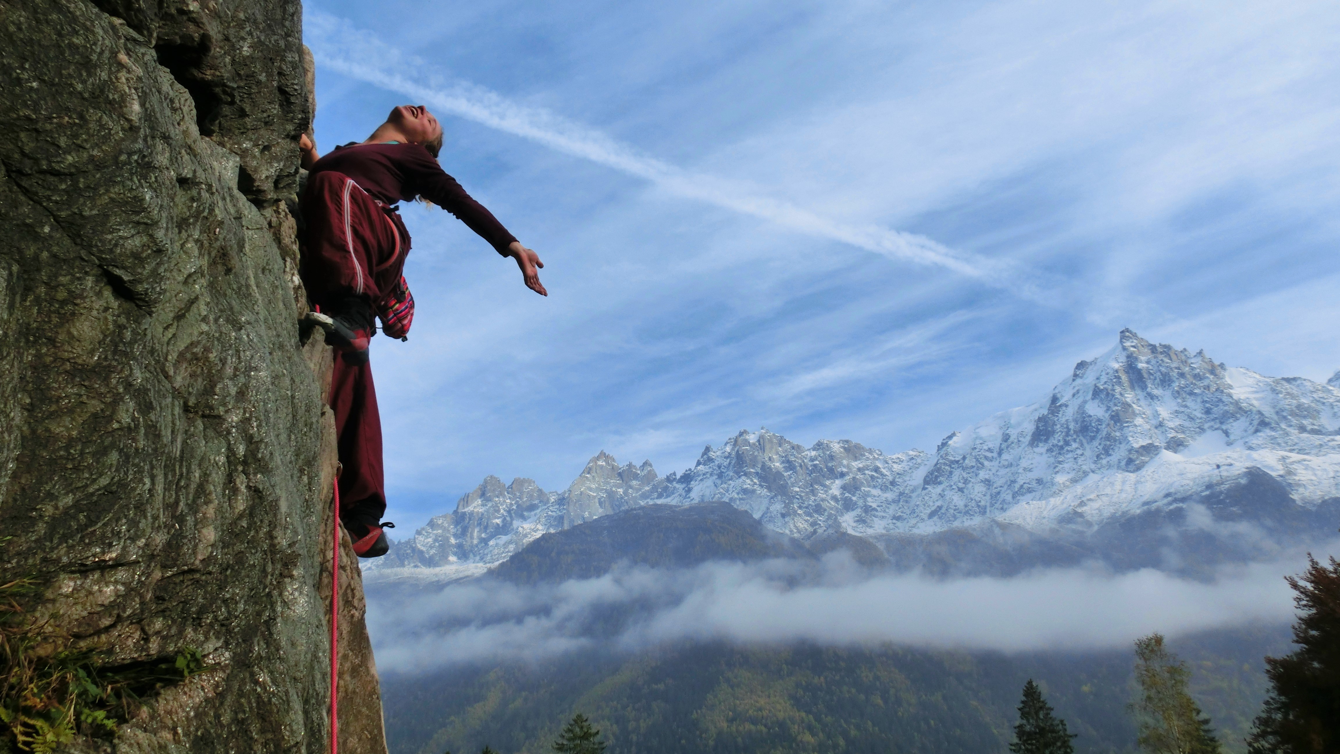 We lunchen naast een groot rotsblok in de zon. Het is geen dag van harde routes, noch van veel routes, een dag waarop het klimmen eigenlijk secundair is. Met stokbrood in mijn hand staar ik naar de kinderen die rondrennen tussen de klimtouwen en het zwartglanzende hondje dat het heeft gemunt op onze pesto. Naar Fieke die stil tegen het rotsblok leunt en de Mont Blanc die ons haar zegen geeft vanaf ongrijpbare hoogte. Ik doezel weg in de tijd waar ik op zonnige dagen eindeloos buiten speelde, rende en klom, achterna gezeten werd en bloemetjes plukte, buren lastig viel en naar binnen geroepen werd voor boterhammen en limonade. Het maakt me verdrietig en gelukkig tegelijkertijd.