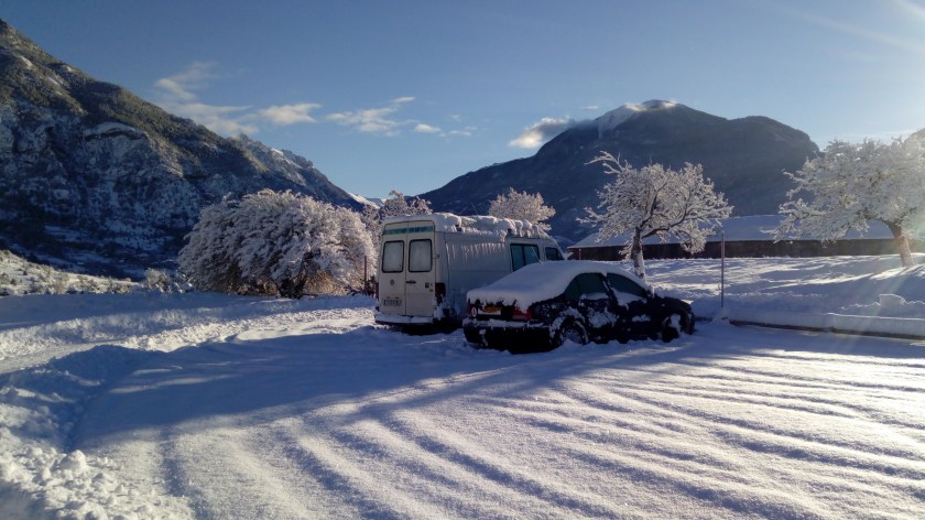 We staan hier op de parkeerplaats van Chantemerle tot de wegen weer tevoorschijn komen. De winter bepaald. Misschien komen we pas weer weg in de lente; dan zijn Bora en ik beide niet meer dezelfde.