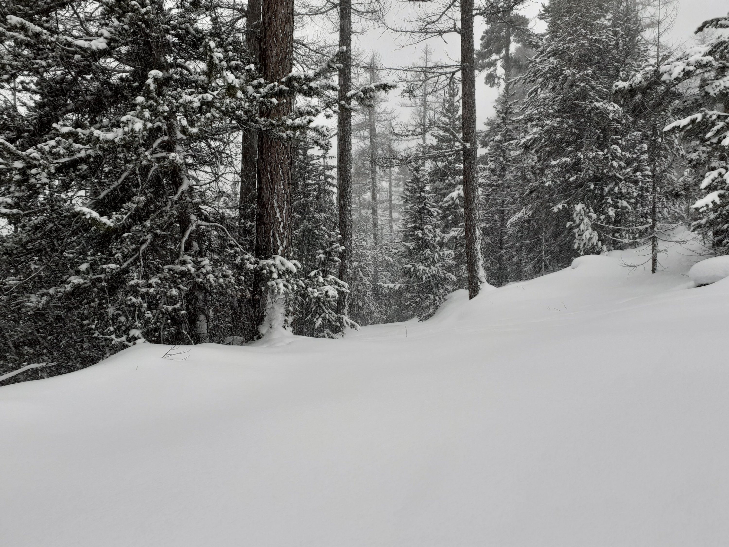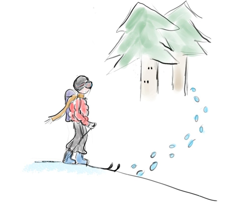 Vlak voor Montgenèvre maak ik uiteindelijk ommekeer, omdat ik geen zicht meer heb op de helling die zich boven me bevindt en al die gelukkige sneeuw niet graag in één keer op mijn kop krijg. Ik klik mijn ski’s vast en dein vervolgens naar beneden, heen en weer door de poedersneeuw, plons plons tussen de bomen door, voel me net als een dier in het doodstille wild.
