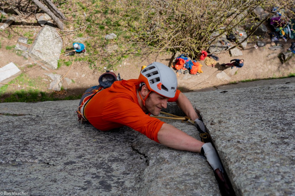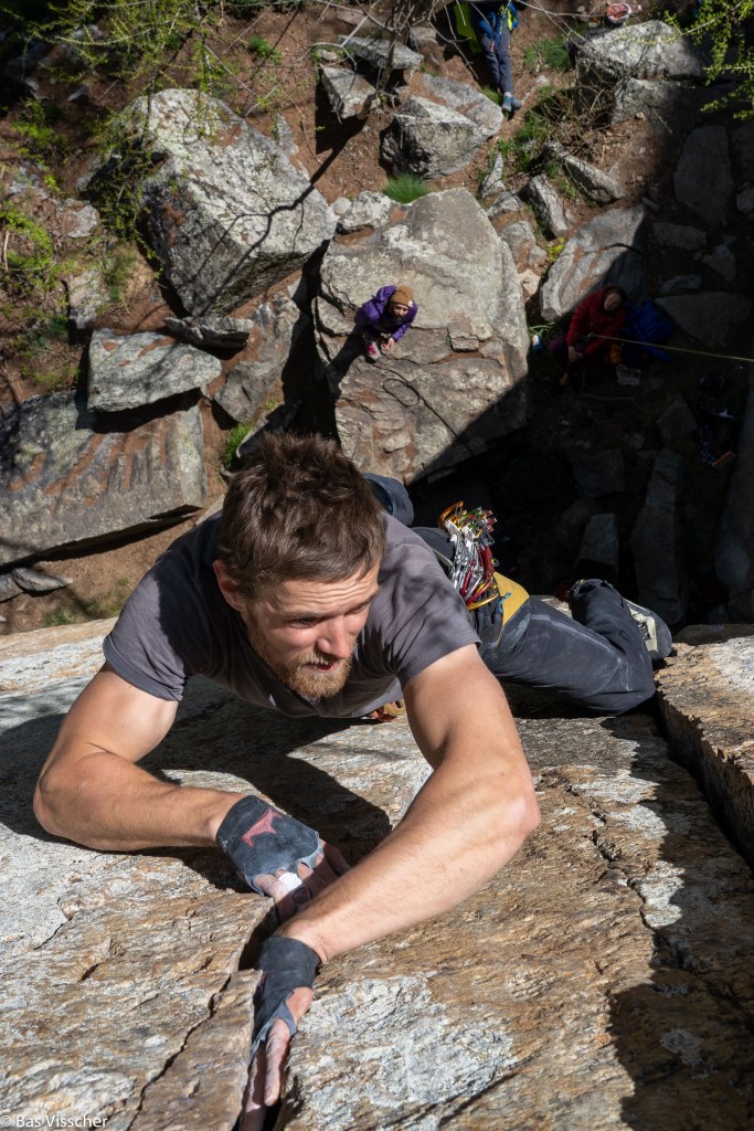 Bas, bedankt voor de tips, de foto’s en motivatie, zonder jou waren Thib en ik wanstaltig slechte spleetklimmers gebleven (het gaat inmiddels iets beter). Wat hoop ik op een dag het niveau te bereiken om samen wat bescheiden (berg?)scheuren aan te vallen. Ik zal er hard aan werken.