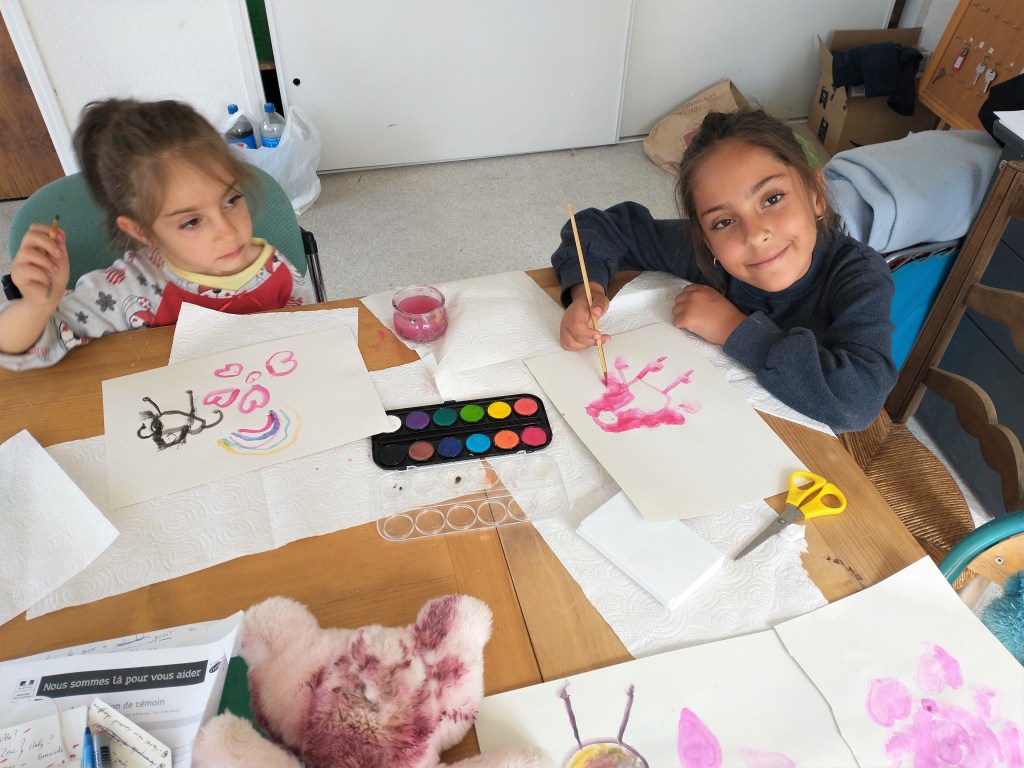 Omdat het afgelopen week iets rustiger was in het centrum (100 migranten in plaats van 160 vanwege een probleem met het openbaar vervoer in Italië) nodigde ik twee Afghaanse zusjes uit in mijn bureau om aan de andere kant van mijn werktafel te komen waterverven. Dat was erg gezellig. Na tien minuten begonnen ze zichzelf onder te verven en na twintig minuten voelden ze zich voldoende op hun gemak om van hun stoel af te komen en het bureau ‘te ontdekken’. Ik heb die avond moeten inhalen wat ik die ochtend niet aan administratie heb kunnen afronden (niets).