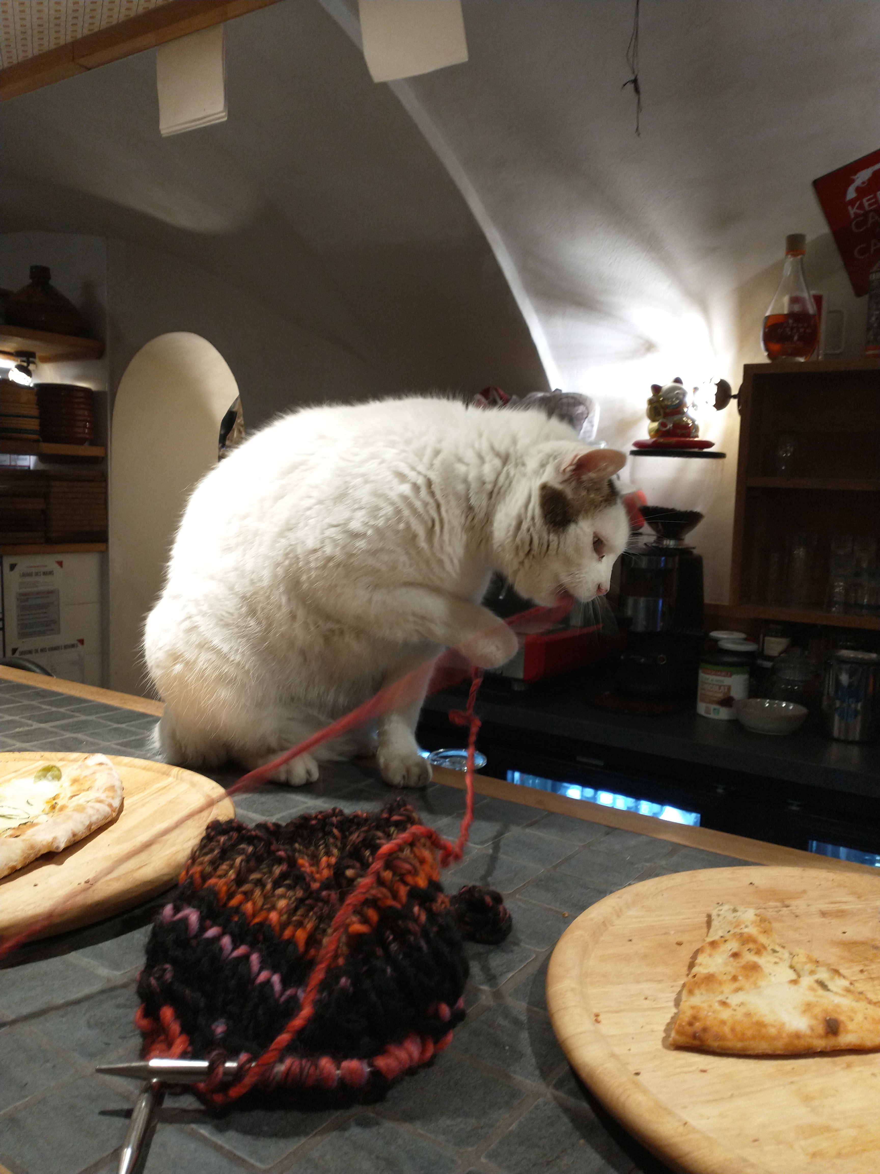 En dit was een enorme kat in de lokale kroeg die er niet vandoor ging met de pizza maar met het breiwerkje.